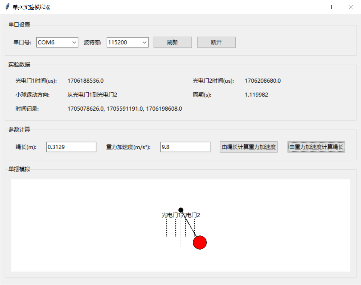 修改后,又发现其计算的重力加速度数值不正确,怀疑是将两次光电门触发的时间之差作为单摆周期时间,给AI以下提示词修改代码:1当没有检测时间大于3秒后,绳子垂直于平面 2这个计算重力加速度有问题,应该是获取三次的时间数据,用第一次与第三次的时间差为单摆周期的时间